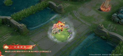 专属回城:哪吒踏入山河社稷图秘境收集法宝,搭乘太乙真人的飞天神兽驶出画卷,返回泉水瞬间,神兽幻化为风火轮;随机行走动作:将火尖枪抛掷空中,斜坐枪身凌空飞行,风火轮环绕周身转动。