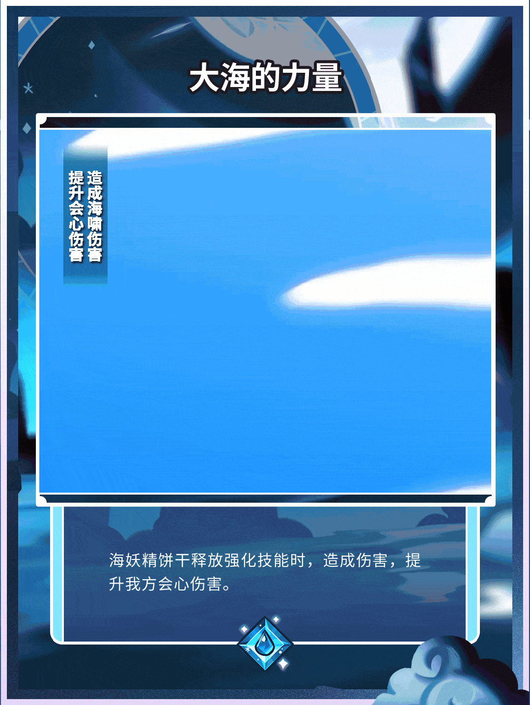 释放技能召唤巨浪攻击敌人,造成伤害与眩晕,同时提升我方全体会心伤害。