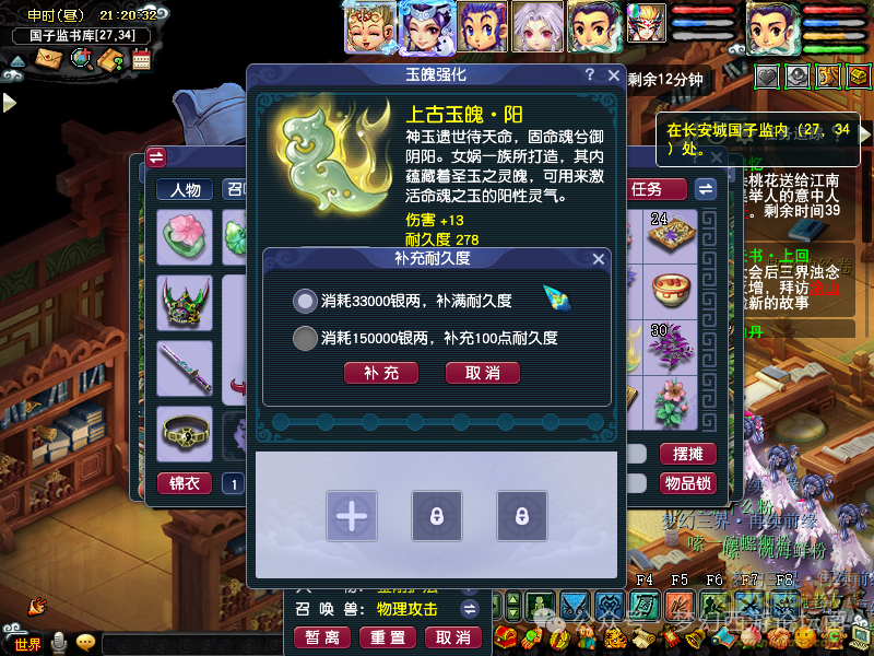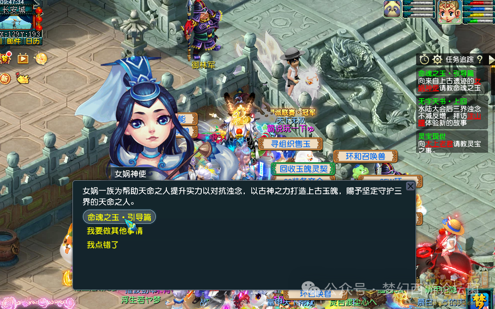 1、获得方式(1)解锁命魂之玉系统后,少侠可通过在长安城(129,193)女娲神使处接取“铸魂任务”来获得“上古玉魄”。