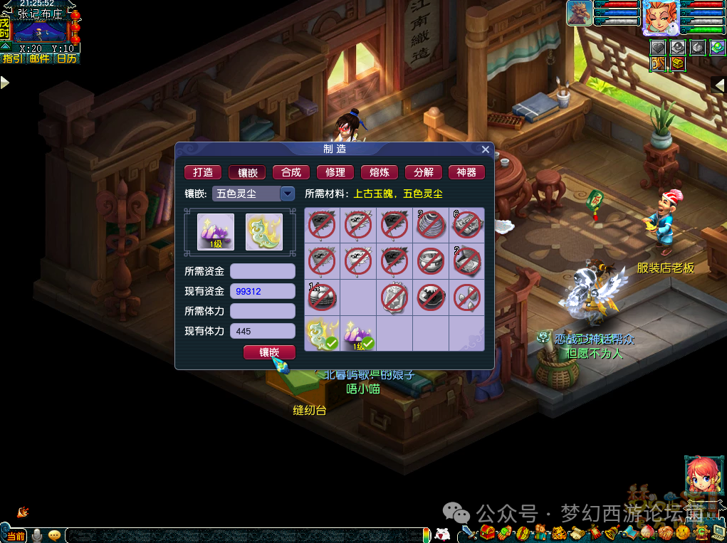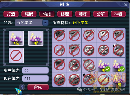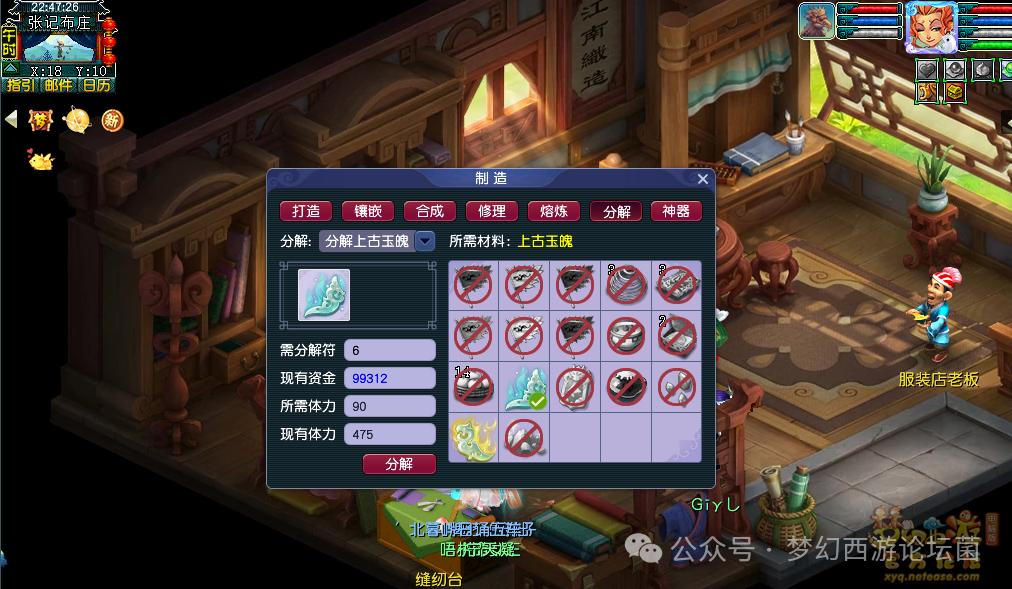 特别说明:“上古玉魄”的耐久度消耗不受门派特色等减免效果影响。7、装备分解在打铁炉或缝纫台处可消耗体力和分解符分解“上古玉魄”,获得3个“五色灵尘(1级)”。