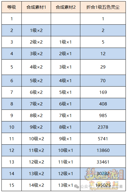 特别说明:(1)合成2级“五色灵尘”需要消耗2个1级“五色灵尘”;(2)合成3级及以上的“五色灵尘”,需要消耗2个低1级的“五色灵尘”和1个低2级的“五色灵尘”;(3)合成需要消耗体力,且必定成功。1-15级五色灵尘合成所需成本如下图所示:
