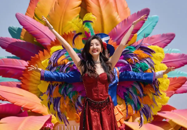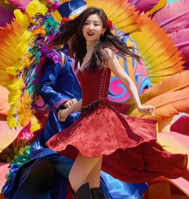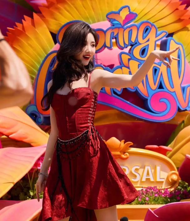 最近有网友在北京环球影城撞见了甜妹毛晓彤,她一身火红的连衣短裙,裙摆飞扬,显得腿又长又直。脚上踩着一双酷酷的黑色高跟长靴,又美又飒,这红裙的华丽高调跟黑色长靴的冷酷劲儿一搭,那种“张扬又不失利落”的美感立马出来了。头上还别了一朵同样热烈的红花,衬得她皮肤白到发光,微卷的长发搭在肩头,这整个造型,说她是哪个复古画报里走出来的人儿都信。