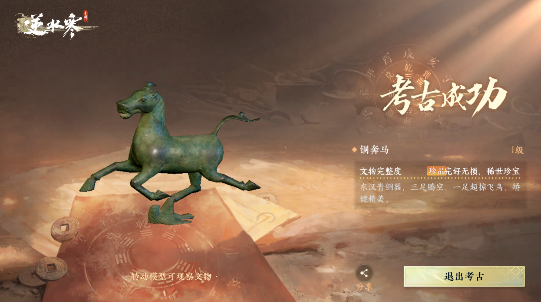 此外,《逆水寒手游》还通过一系列精心设计的活动和任务,将铜奔马的元素巧妙地融入其中,玩家可以通过游戏中的考古玩法亲自挖掘出这件国宝级文物,也可以在剧情中进一步了解铜奔马背后“守卫疆土、保家卫国”的爱国精神。