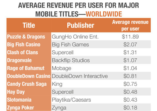 数据****SuperData发表的2014年4月美国数字游戏报告显示,Gungho的益智手游《智龙迷城》ARPU值排名第一,高达11.89美元,是第二名《Big Fish Casino》的近6倍,比前十名其他九个游戏ARPU的总和还多。但这样一款吸金能力超强的产品,却迟迟一直没有进入中国,且类似《智龙迷城》玩法的山寨手游在国内的成绩也并不好,虽然《逆转三国》曾取得了月收入2000万的成绩,但大部分的收入还是来自于港澳台及海外。