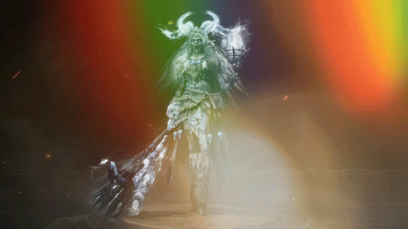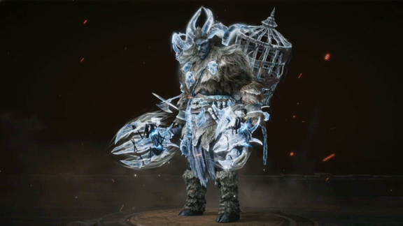 狂骑士身披霜雪冰晶,全身的冰雪特效看上去华美而纯粹。兽皮和兽骨制成的下装和披风,充满了野性魅力。头上冰晶材质的巨大半透明兽角和下半身的兽蹄,充满了威慑力。身上缠绕的锁链,伴随着周身飘落的细小冰霜,危险和冰冷气息扑面而来。
