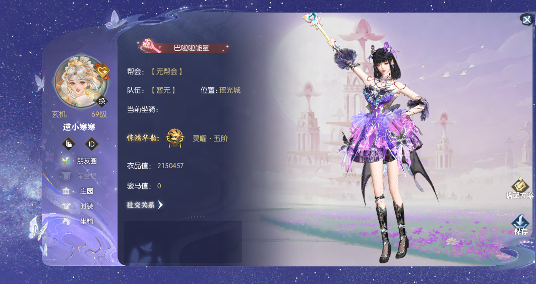 当同门集齐稀有发型【夜蝶影/幽蝶语】、【游风乐逸/魔韵灵仙】、大轻功皮肤【浣星裳】中任意2款与2套联动时装,即可获得个人名片背景【魔仙之堡】。