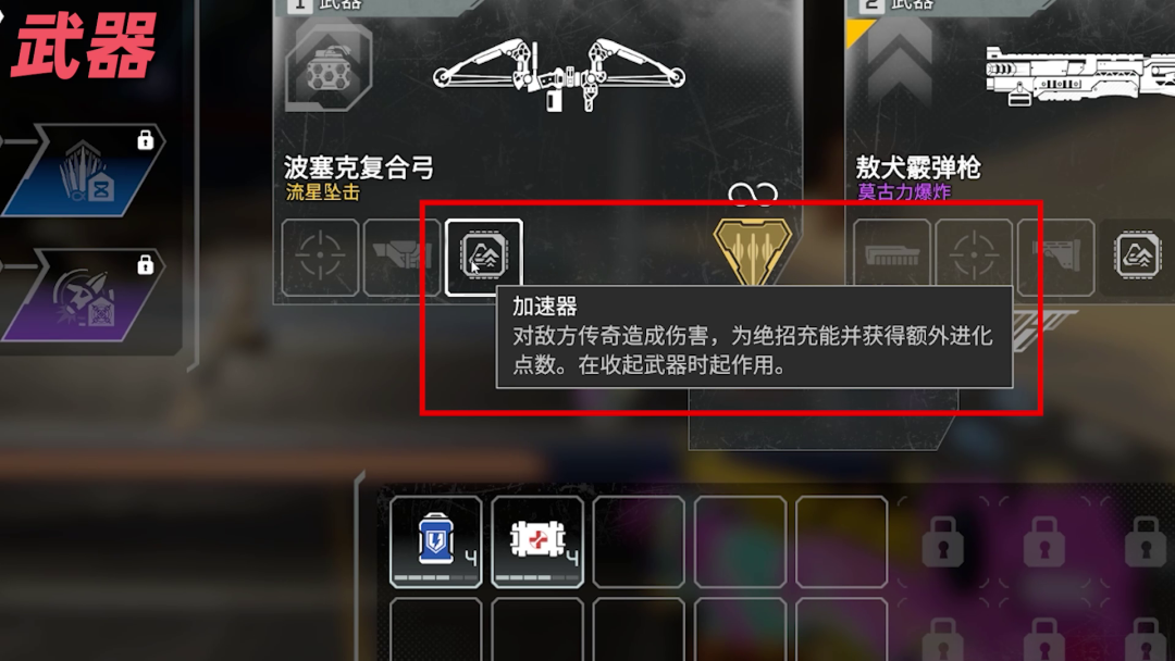 然后有的枪上面,有这个加速器的配件,击倒可以直接获得大招充能,如果你不知道选哪把武器,选带加速器配件的也行。