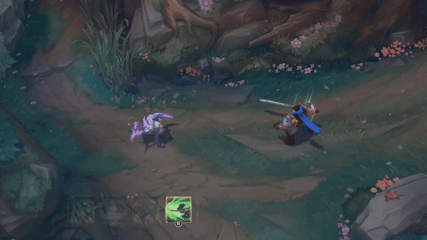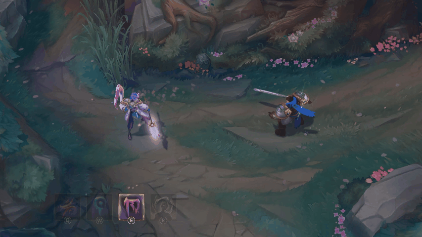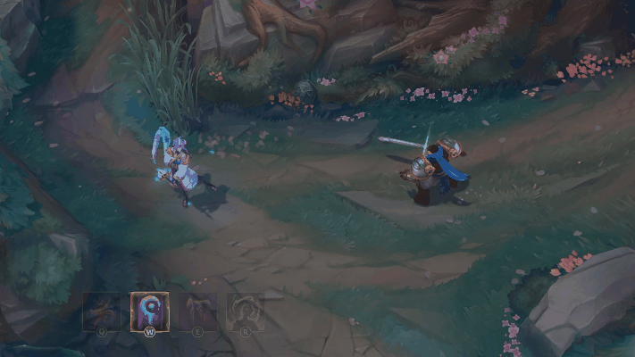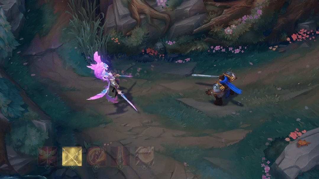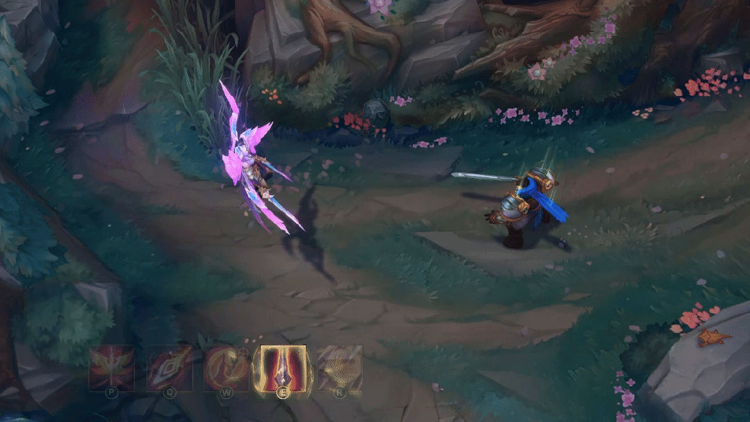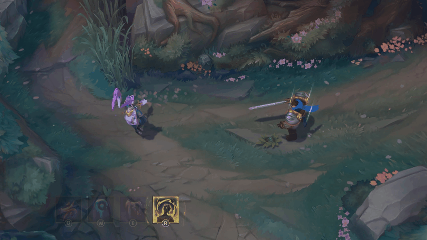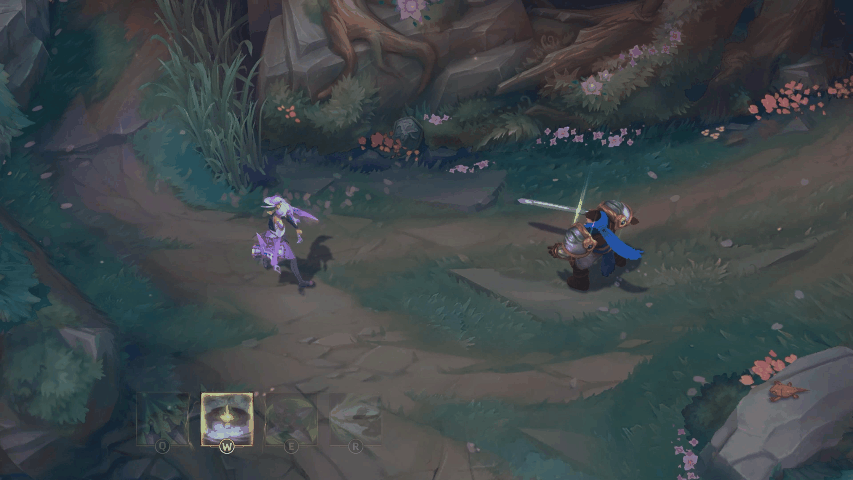 凯尔用蓝色的屏障包围一名友方英雄,使其免疫伤害一段时间,随后发射剑雨,对附近敌人造成魔法伤害,地面的雾气中浮现绽灵花图案。