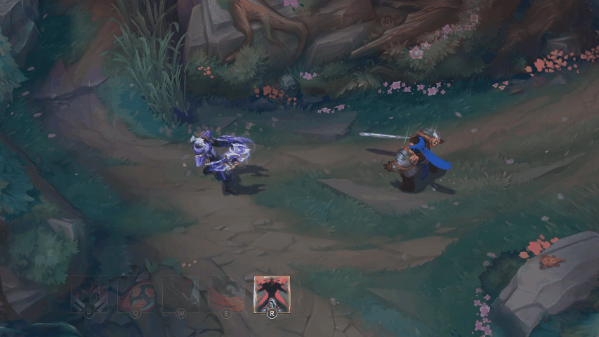 阿卡丽释放一团混沌的雾气并为自身提供移动速度,雾气中漂浮着幽紫色的花朵。阿卡丽处于烟雾中时会隐形并提升最大能量值。