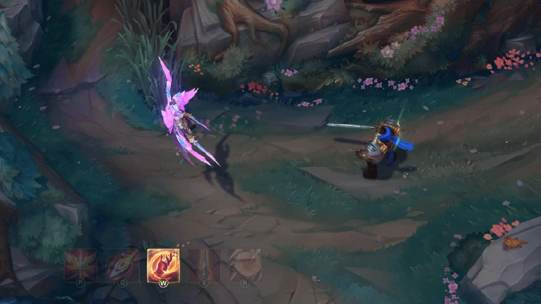 人类形态:奈德丽投掷她的标枪,伴随着花瓣洒落,造成基于标枪飞行距离的魔法伤害。命中敌人浮现绽灵花标记。