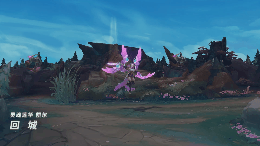 凯尔轻舞长剑,剑光流转间绽灵花瓣纷扬飘落,她舒展羽翼凌空而起,在漫天飞花中定格优雅身姿,完成回城仪式。
