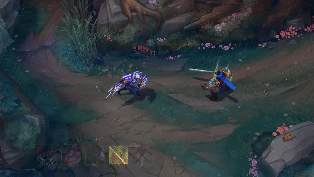 凯尔发射一把灵剑,闪烁着蓝紫色的光芒,对敌人造成魔法伤害和减速,并移除其护甲和魔抗。