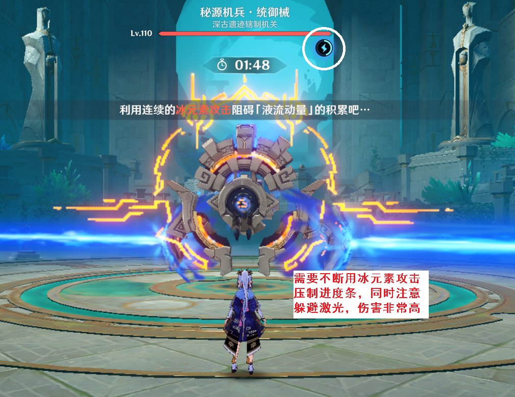 ②在战斗中,至少要维持0.6秒一次的冰元素攻击,来压制其能量条。也就是至少要有1前台冰+1后台冰,或者2后台冰的情况,才能维持能量条压制,单冰已经压不住了。