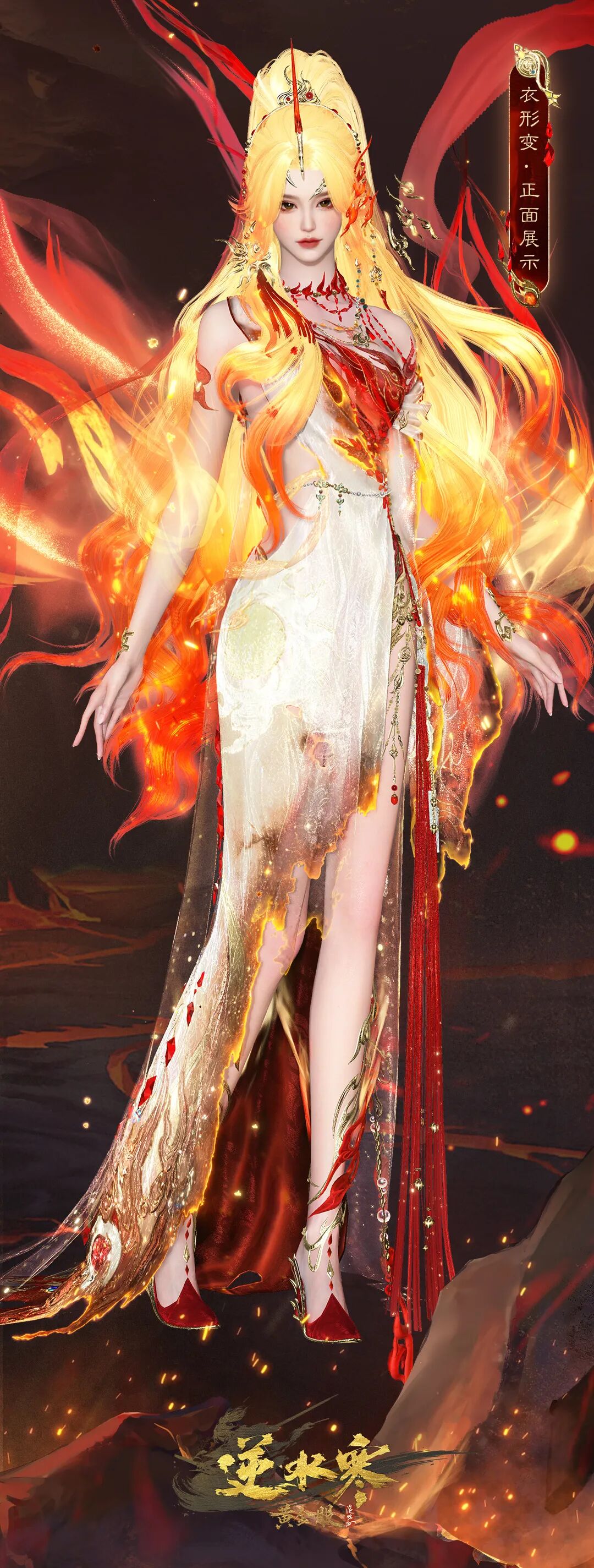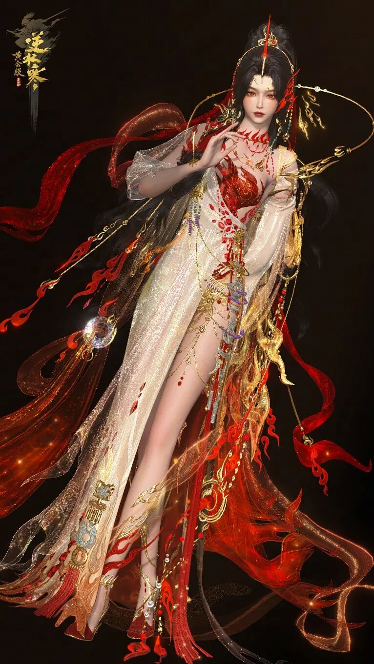女款时装飘逸灵动,周身缠绕的焰状丝带随风舞动。赤红刺绣点缀于纯白衣衫之上,如同迸溅的火星,美得艳丽夺目又动魄惊心。