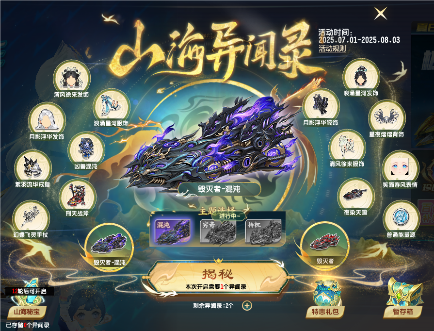 7月1日-8月3日,参与【山海异闻录】玩法活动,有机会得极品S车【毁灭者】及其首发山海异闻录系列赛车皮肤【毁灭者-混沌】或其他奖励之一!