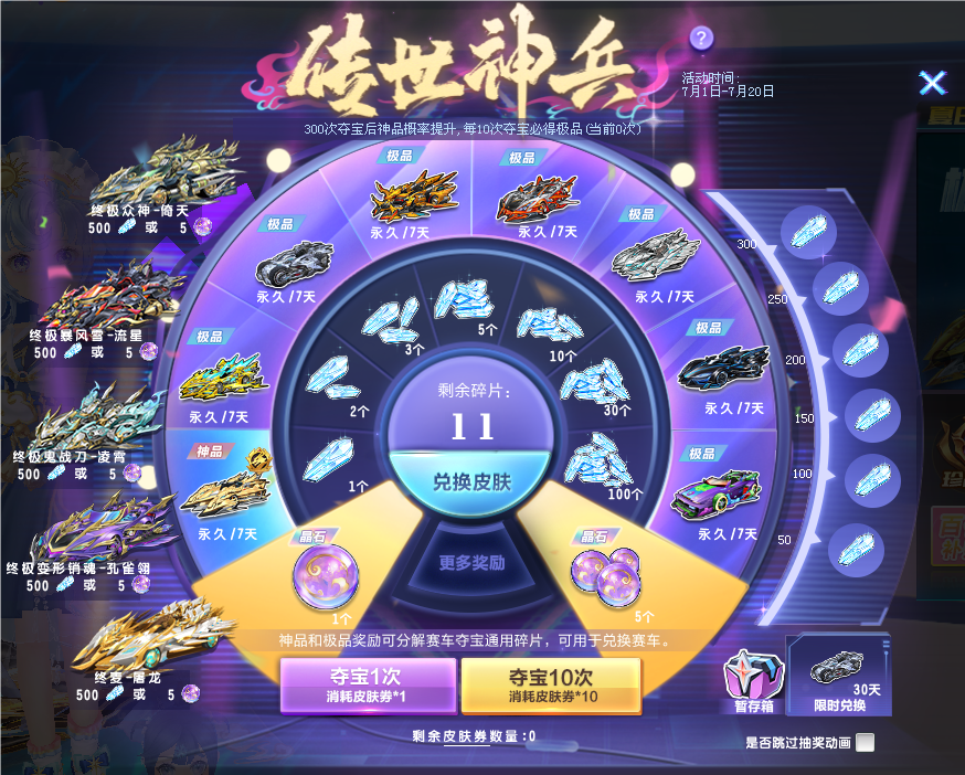 7月1日-7月20日,参与活动【传世神兵】有机会获得:至尊级极品S车【至尊·麦凯伦】或其他奖励,还可兑换传世神兵系列首发赛车皮肤【终麦-屠龙】!