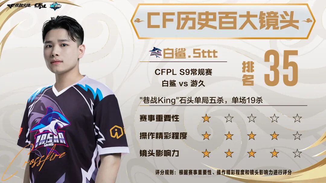 位列第35名的镜头来自CFPL S9常规赛,白鲨对阵游久的比赛。石头单局五杀,单场19杀。这也就是他"巷战King"昵称的由来!