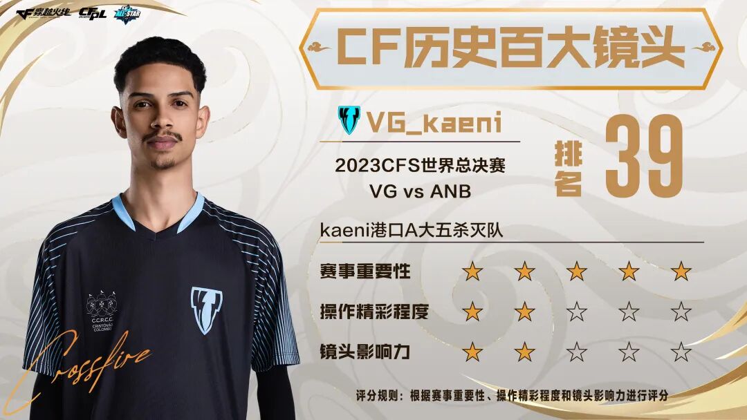 位列第39名的镜头来自2023CFS世界总决赛,ANB对阵VG的比赛。kaeni在港口A大五杀灭队,展现了CFBL赛区过硬的枪法。