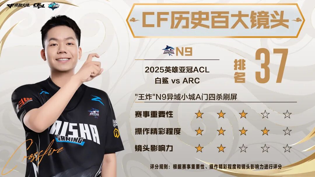 位列第37名的镜头来自2025英雄亚冠ACL,ARC对阵白鲨的比赛。"王炸"N9异域小城A门四杀刷屏。