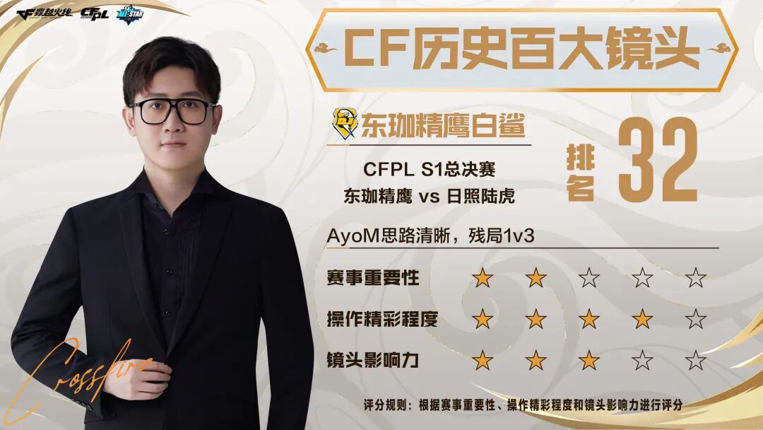 位列第32名的镜头来自CFPL S1总决赛,东珈精鹰对阵日照陆虎的比赛。AyoM思路清晰,残局1v3。