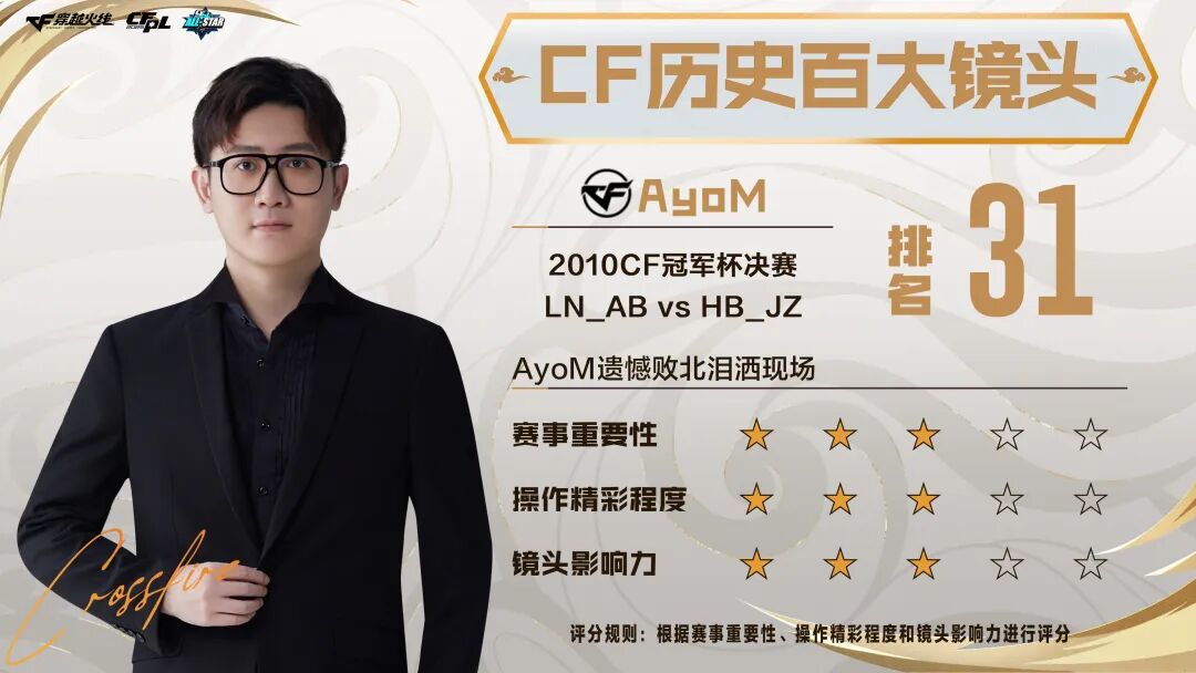 位列第31名的镜头来自2010CF冠军杯决赛,LN_AB对阵HB_JZ的比赛。两大狙神正面对话,最终AyoM遗憾败北泪洒现场。