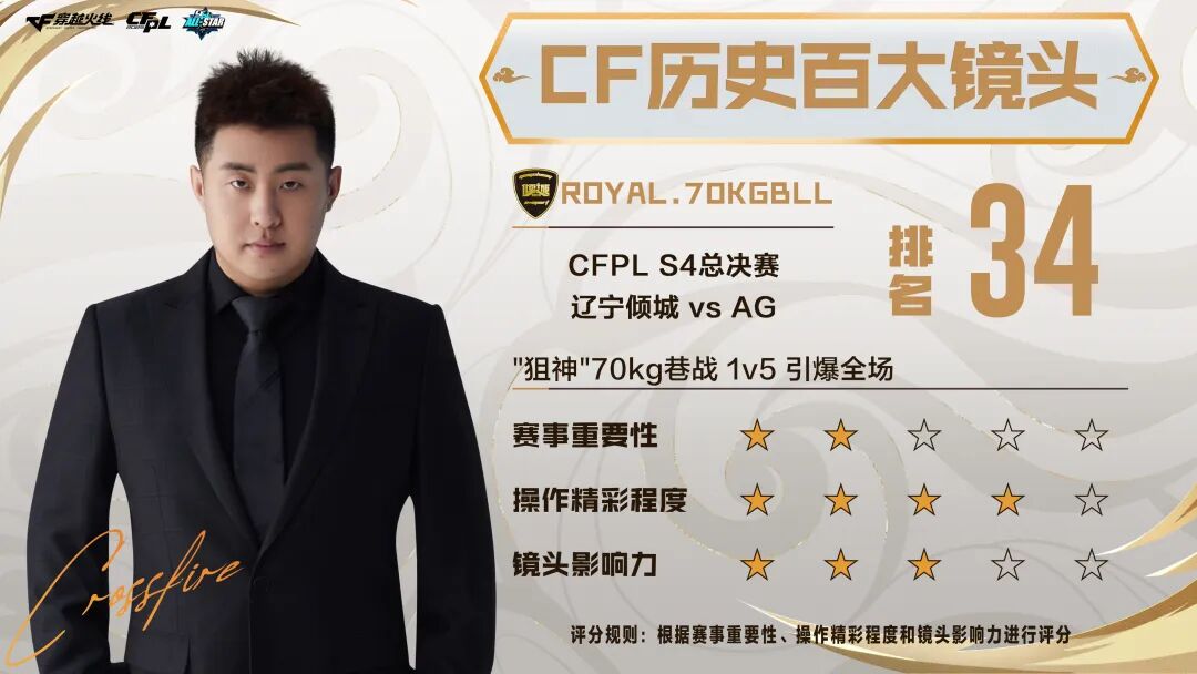 位列第34名的镜头来自CFPL S4总决赛,辽宁倾城对阵AG的比赛。"狙神"70kg巷战1v5,引爆全场。