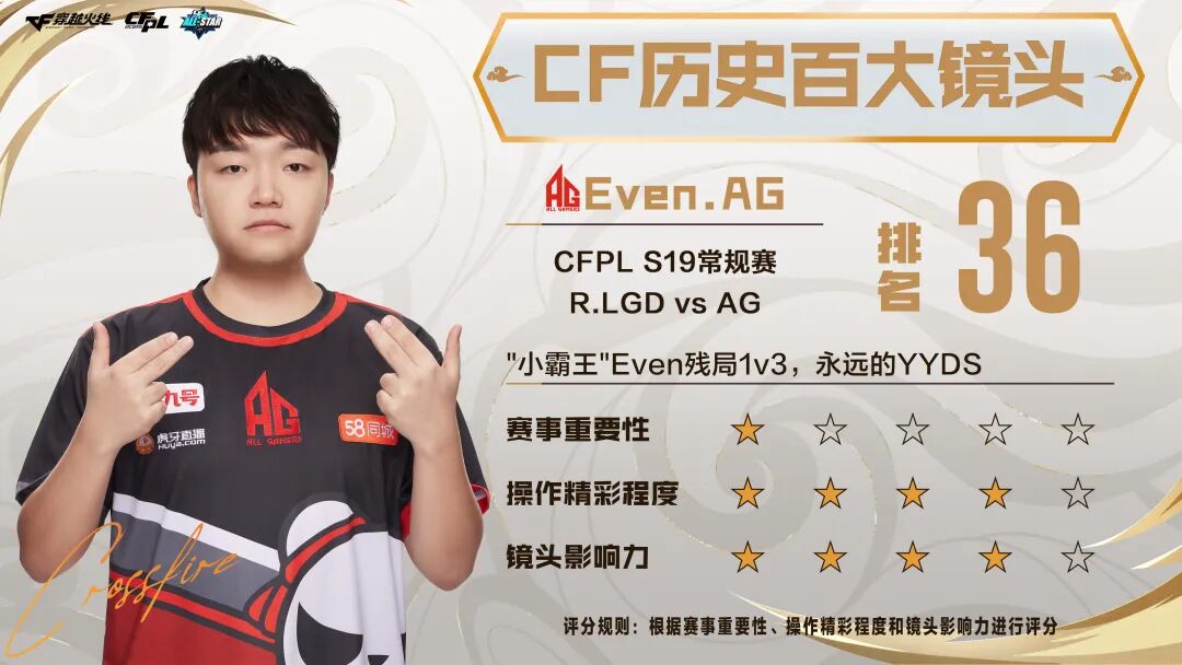 位列第36名的镜头来自CFPL S19常规赛,R.LGD对阵AG的比赛。"小霸王"Even卫星基地残局1v3,永远的YYDS。