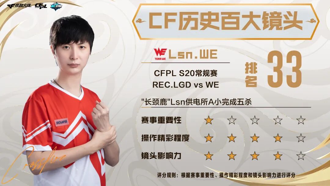 位列第33名的镜头来自CFPL S20常规赛,REC.LGD对阵WE的比赛。"长颈鹿"Lsn在供电所A小完成五杀。