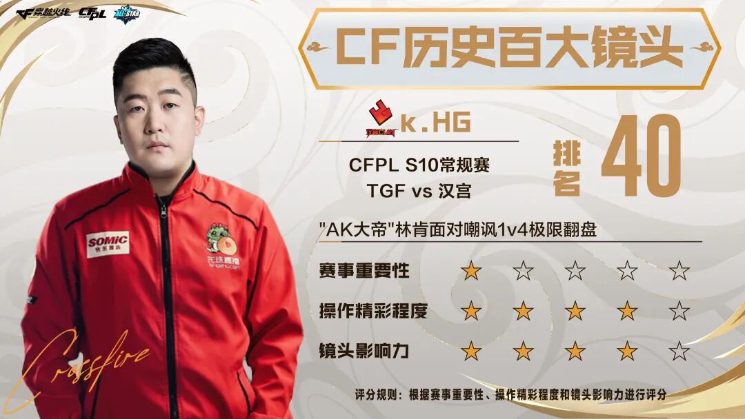 位列第40名的镜头来自CFPL S10常规赛,TGF对阵汉宫的比赛。"AK大帝"林肯面对枣将军的嘲讽,完成了1v4极限翻盘。