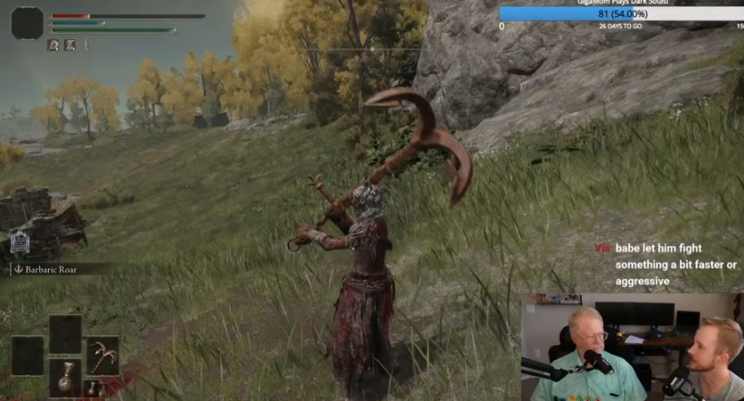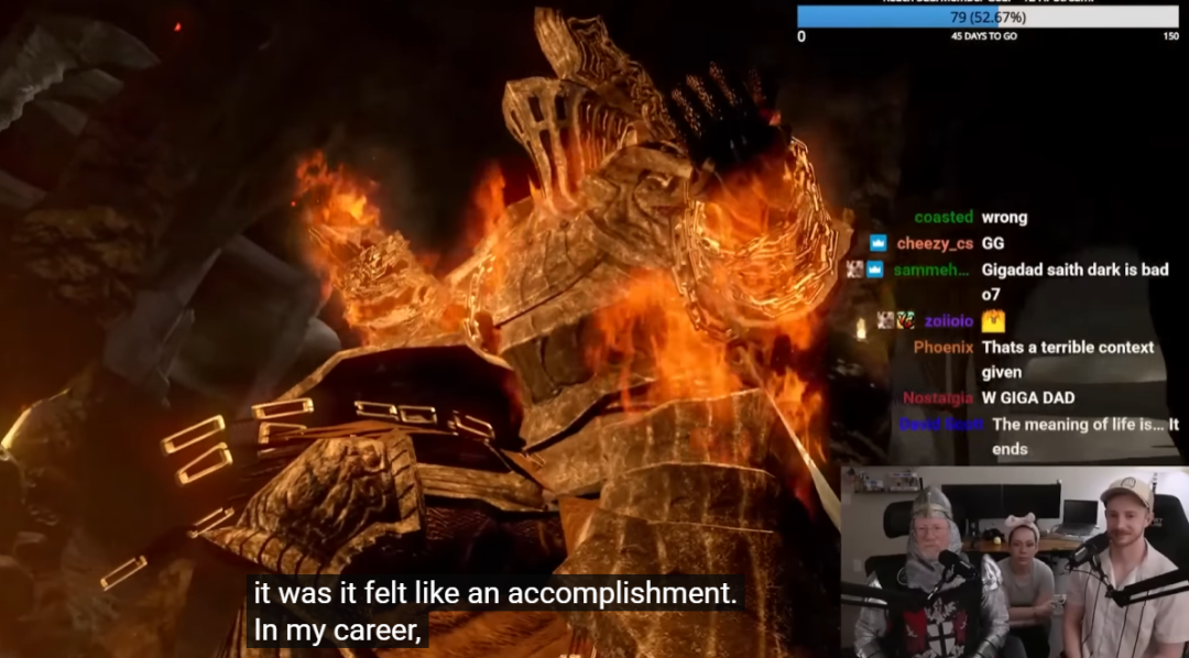九个月的努力、1400多次的失败,几次差点想放弃。但GigaDad始终没有真正停下。他一边被游戏教做人,一边学会了什么是翻滚无敌帧、背刺判定、王城双王的连段套路。他甚至掌握了Twitch(直播)的使用技巧,开始跟观众互动直播打Boss。