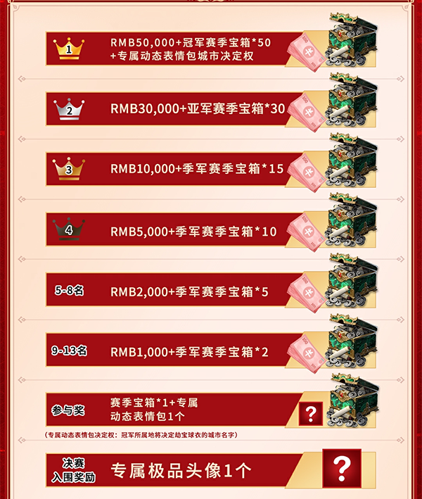 冠军将可获得五万元奖金、赛季宝箱*50以及专属动态表情包城市决定权!(专属动态表情包决定权:冠军所属地将决定劫宝球衣的城市名字)