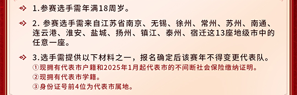 选手需提供以下材料之一:现拥有代表市户籍和2025年1月起代表市的不间断社会保险缴纳证明;或者现拥有代表市学籍;或者身份证号前4位为代表市属地;报名确定后该赛年不得变更代表队。
