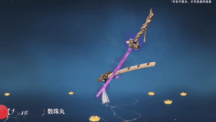 木质刀鞘上缠绕着一串念珠,刀锷处如莲花绽放,幽萤的紫色刀身蕴藏着神秘的力量。