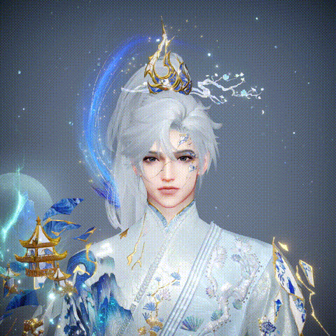 他立于山巅,白衣随风扬起,肩上的薄纱绘着烟雨山河,袖间悬浮的碎瓷片如星辰闪烁。修长的身形衬着衣摆的金色裂纹,如名瓷般的清冷矜贵中透着几分不羁,那身影与远山云雾融为一体,仿佛本就是这天地间最动人的风景。