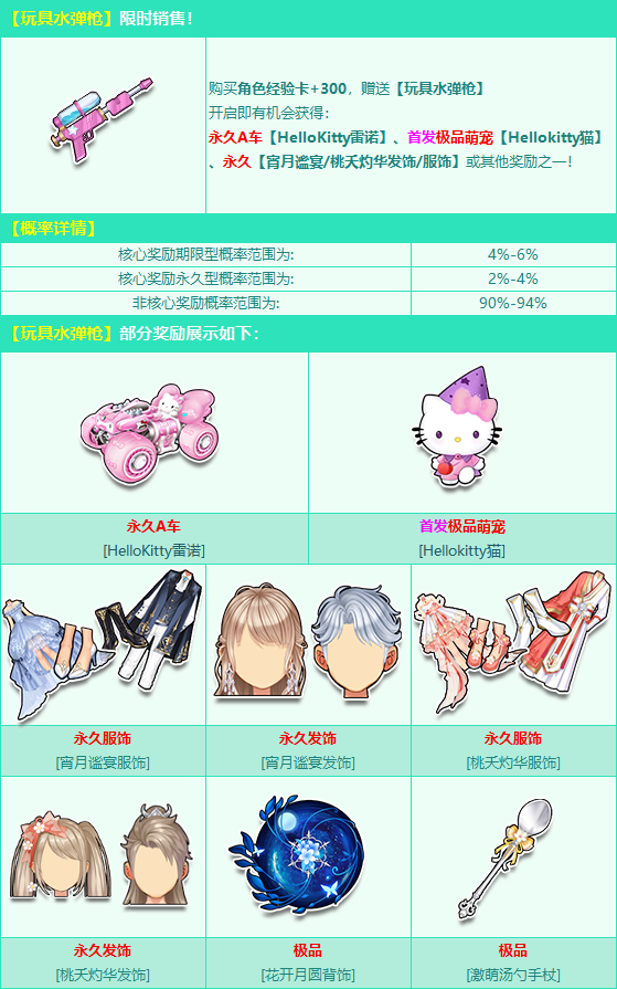 8月4日-9月18日,购买角色经验卡+300,赠送玩具水弹枪,有机会得永久A车【HelloKitty雷诺】、首发萌宠【Hellokitty猫】、永久【宵月谧宴/桃夭灼华发饰/服饰】或其他奖励之一!