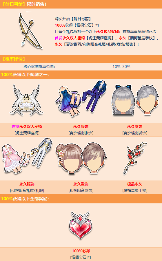 8月21日-10月2日,开启射日弓箭,100%必得情侣宝石*1,且每个礼包随机一个以下永久极品奖励(有概率重复获得永久):首发永久双人座椅【虎王荣耀座椅】、永久【夏汐蝶羽服饰/发饰】、永久【和煦阳音礼服/礼裙/发饰】、永久【腊梅星辰手杖】!
