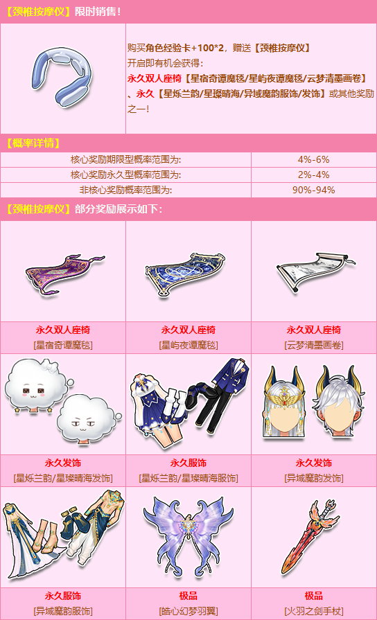 8月21日-10月2日,购买角色经验卡+100*2,赠送颈椎按摩仪,有机会得永久双人座椅【星宿奇谭魔毯/星屿夜谭魔毯/云梦清墨画卷】、永久【星烁兰韵/星璨晴海/异域魔韵服饰/发饰】或其他奖励之一!