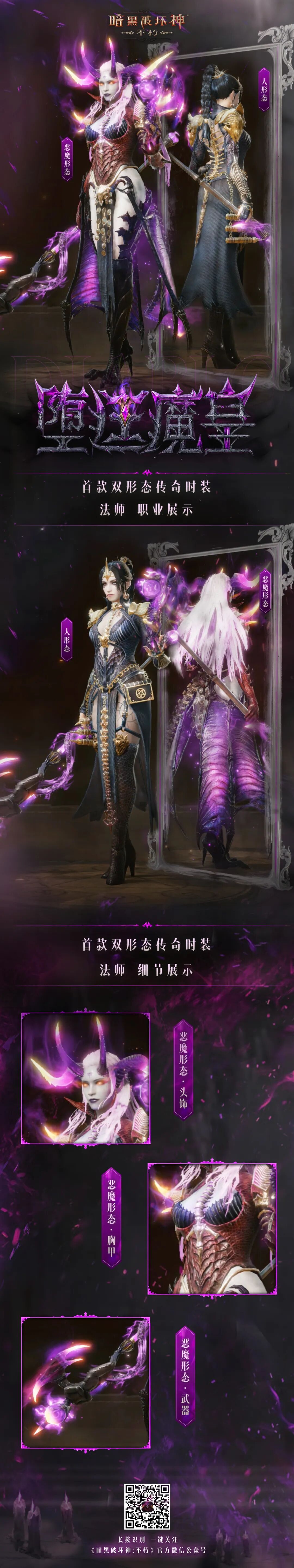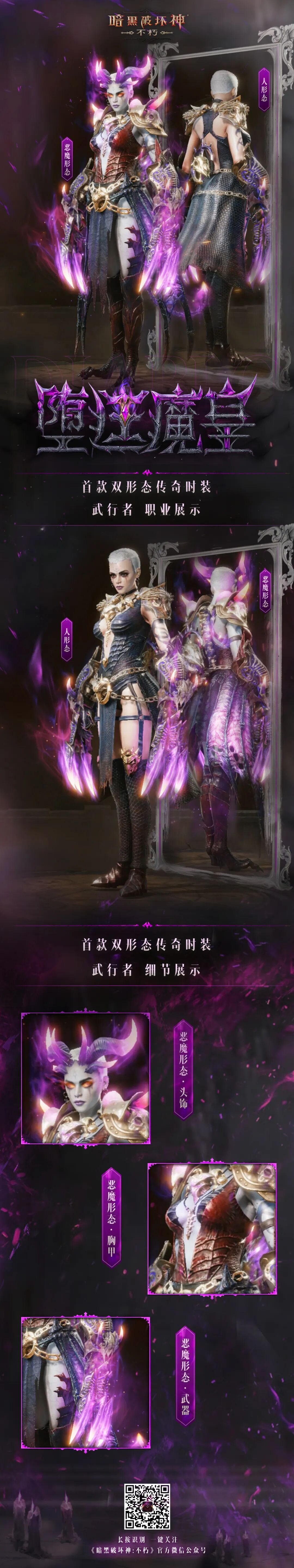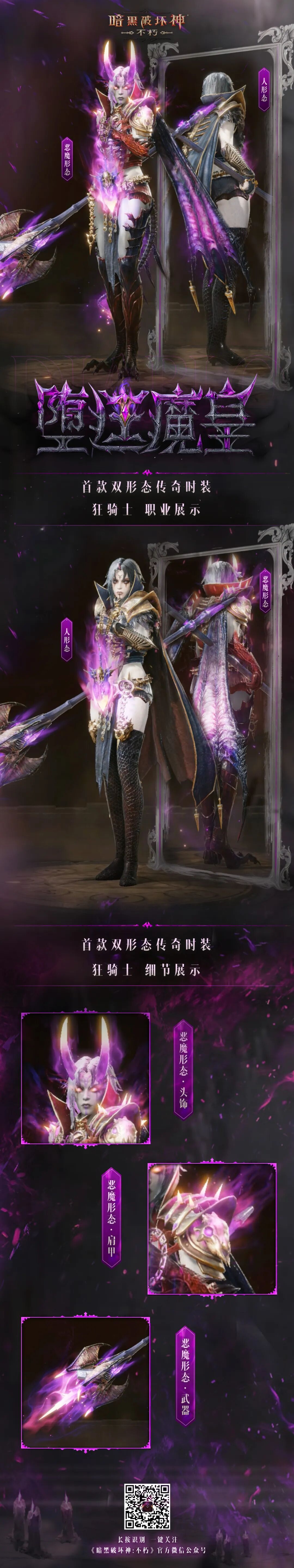 首款双形态传奇时装“堕廷魔皇”奇幻上线,两种形态等你解锁!8月21日3:00开始,参与探索获取套装,还有“噬魂侣”、”孽网领主”限时返场!菠哥已被特效帅哭,真的永远会为神秘而高级的紫色而着迷!