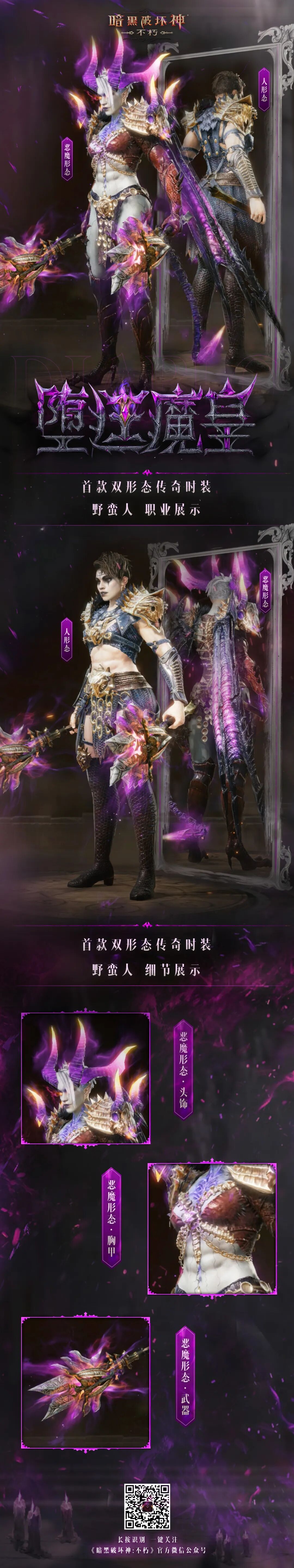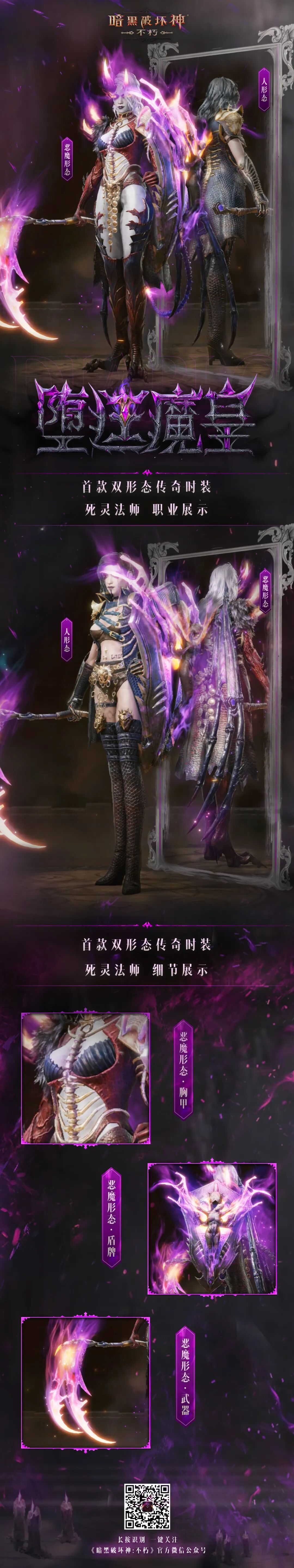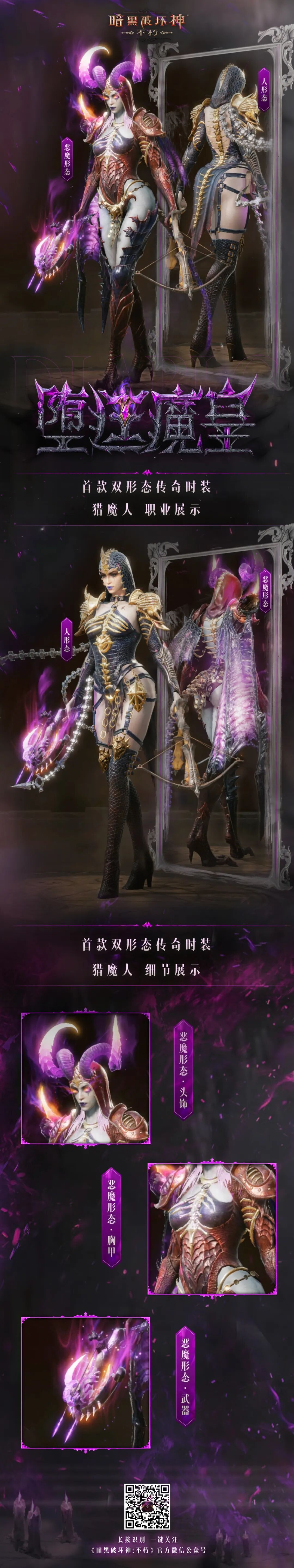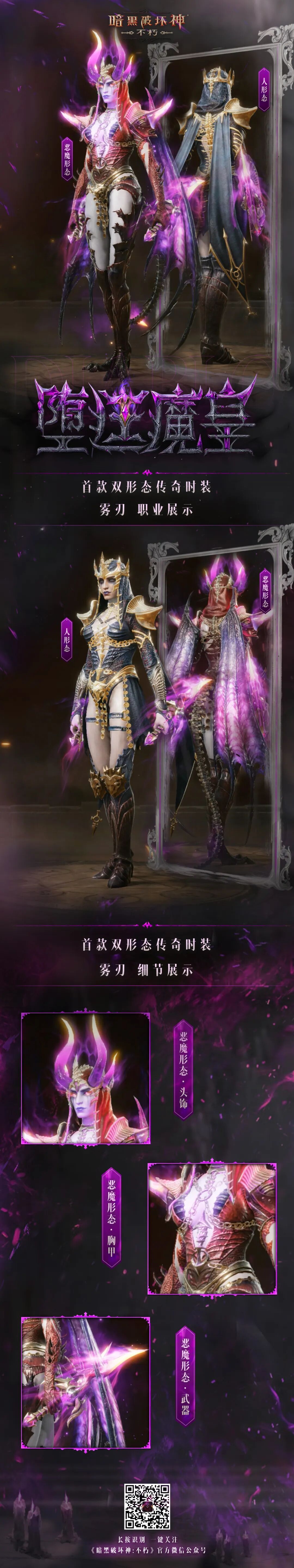 首款双形态传奇时装“堕廷魔皇”奇幻上线,两种形态等你解锁!8月21日3:00开始,参与探索获取套装,还有“噬魂侣”、”孽网领主”限时返场!菠哥已被特效帅哭,真的永远会为神秘而高级的紫色而着迷!