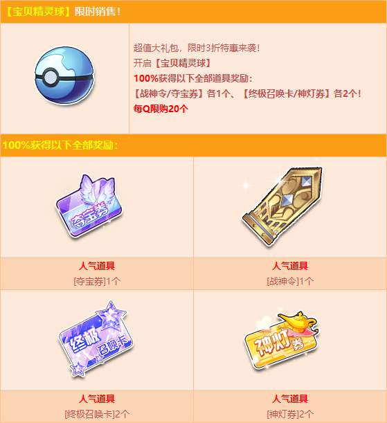 8月27日-9月2日,开启宝贝精灵球,100%获得以下全部道具奖励:人气道具【夺宝券】1个、人气道具【终极召唤卡】2个、人气道具【神灯券】2个、人气道具【战神令】1个,每Q限购20个!