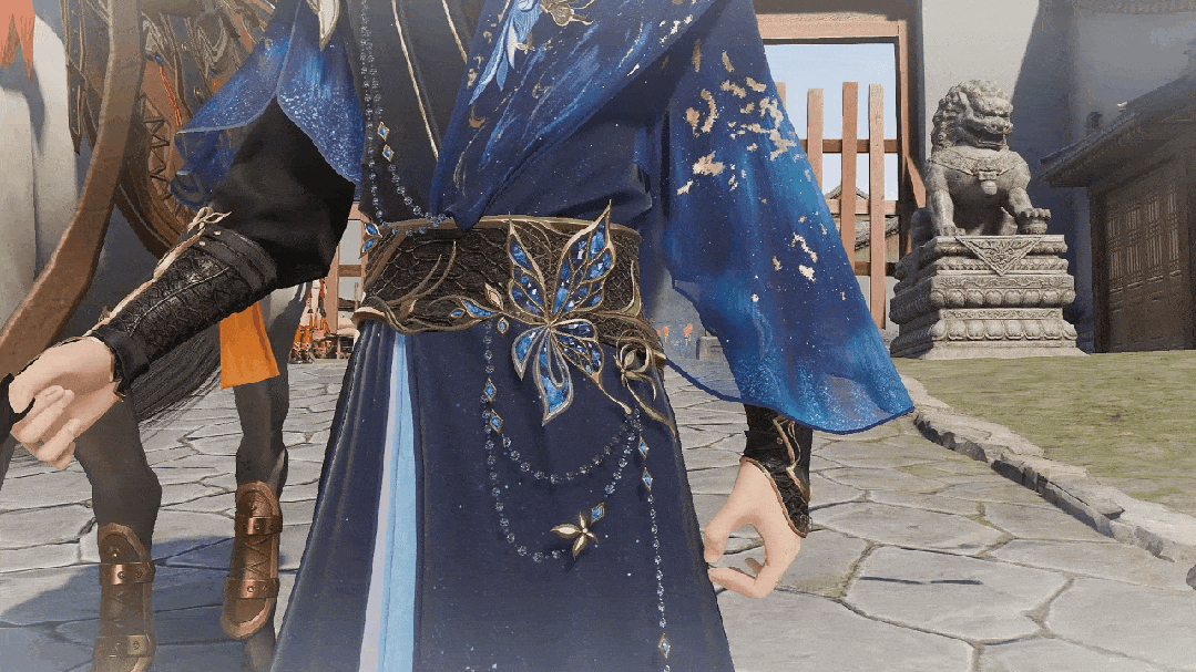 蓝纱如夜,缀着星芒般的金纹,写满书院漫步时的诗意。腰间蝶饰鎏金勾勒出振翅姿态,蓝羽晶石如化蝶时的清光。