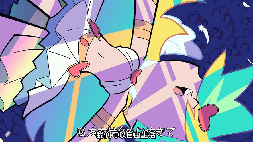 紧接着,天使姐妹花虽然嘴上说起了传统日式的变身念白,但动作却是跳起了性感钢管舞。迪厅般的光点和一阵强劲的小曲儿,在背景里也给足了氛围感。