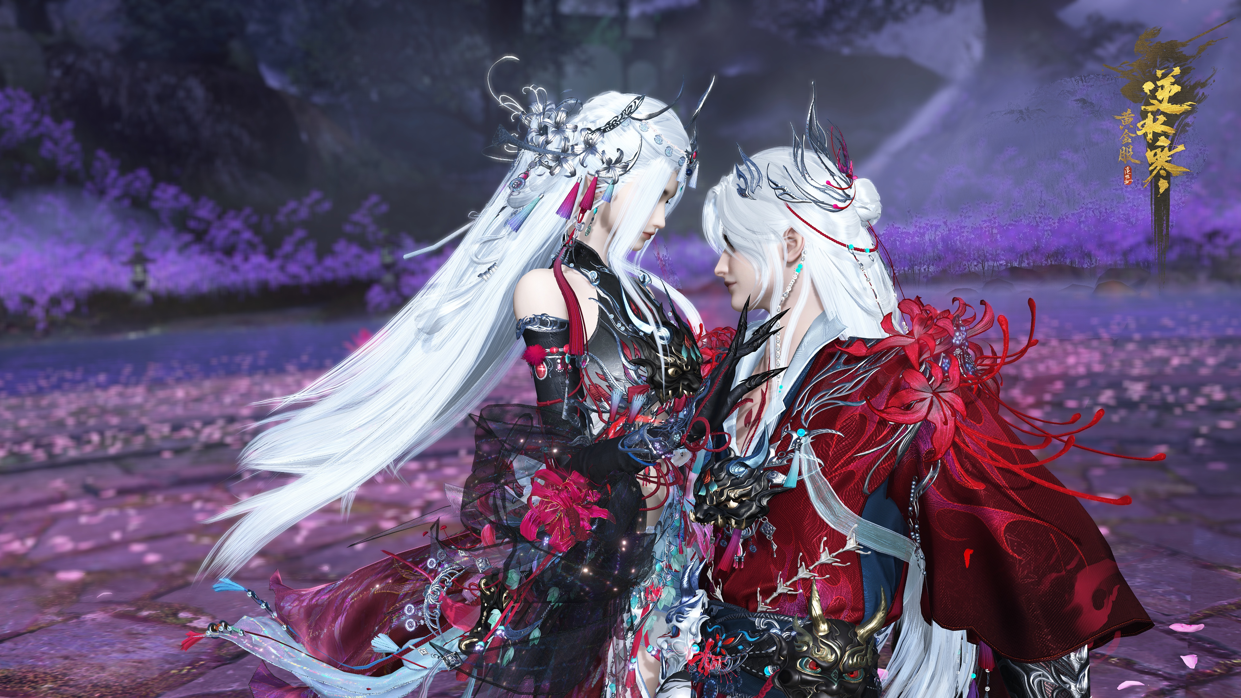 1)时装【绛雪辞川/绯魂寄川】可通过衣形变脱去女款的手套及男女款身后的披纱。女款可通过发型变,取下发饰上的缠绕秀发。