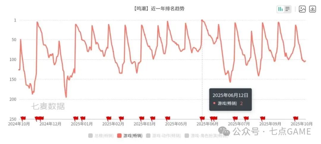此前库洛CEO李松伦曾透露2.X版本的内容从测试阶段就已开始筹备。如今从结果来看,游戏近期的运营成绩也反映出一定的市场认可。《鸣潮》的iOS游戏畅销榜排名在近一年内,已在七个版本卡池开放后冲入TOP 10。其中,2.4版本「卡提希娅」卡池上线期后,其最高排名更是升至第2位——整体来看,游戏在内容更新质量、用户口碑与商业表现上均呈现逆势增长的态势。
