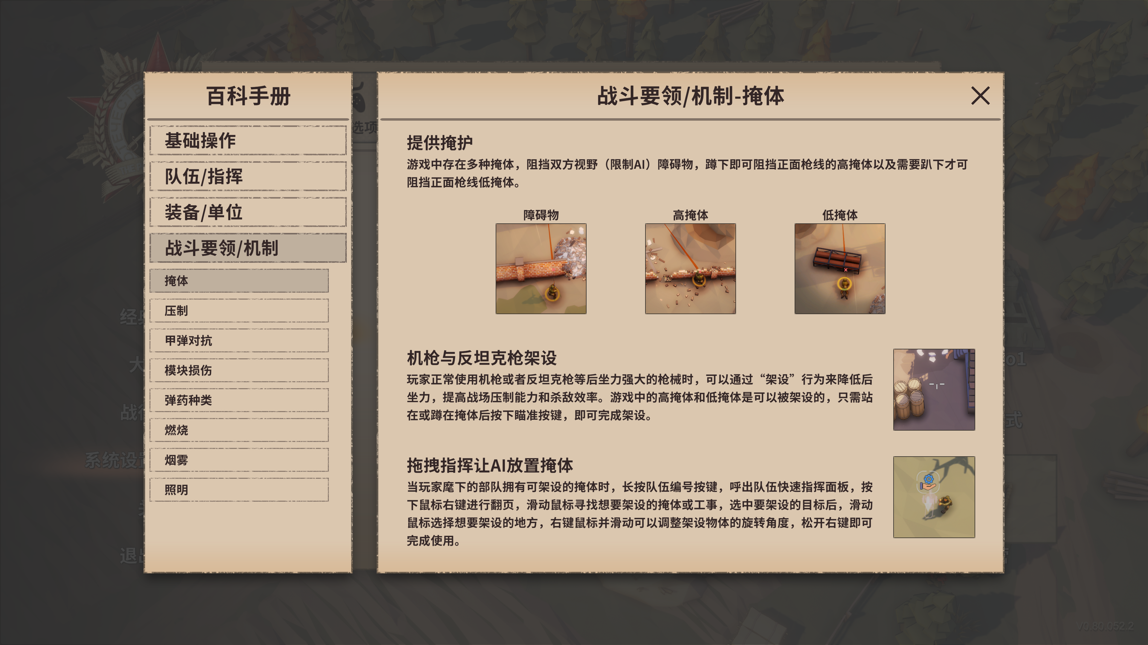 战斗要领/机制:讲解掩体使用、压制机制及燃烧、烟雾、照明等高级战斗技巧。