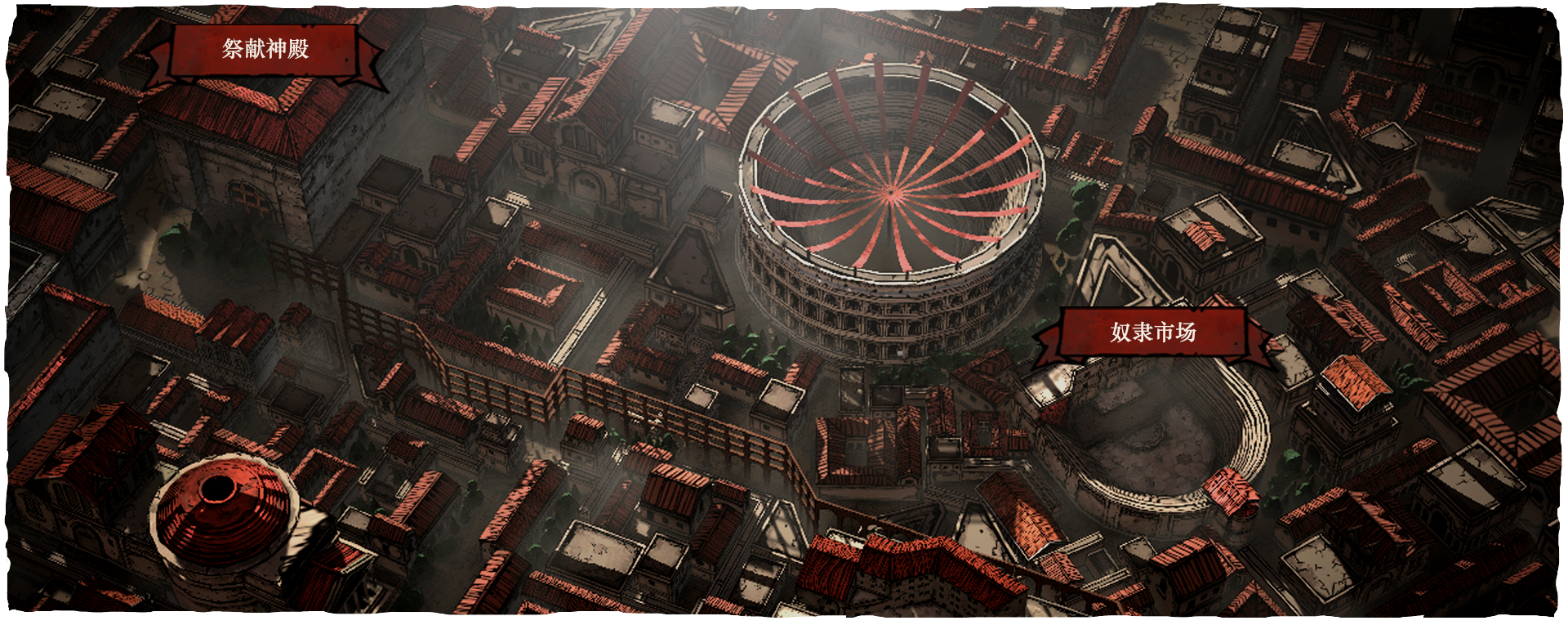 我们复原了部分古罗马建筑,在这里可以选择参与不同的赛事、任务、以及游玩V5版本之前的模式(V5版本战斗系统已经全面更改,但我们保留V4版本内容为一个特殊模式)