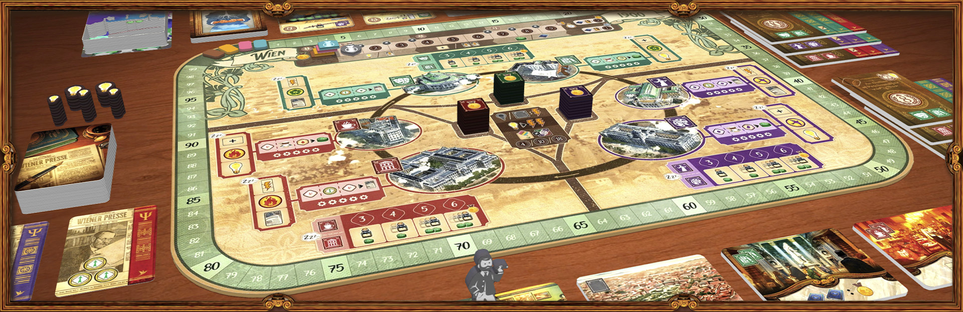 机制上,游戏融合了工人放置与城市图及玩家面板上的轮盘式移动。这些领域深度交织——一方的行动催生另一方的机遇。精通的关键在于创建行动链,使单个选择触发咖啡馆、城市地点与个人发展的连锁收益。