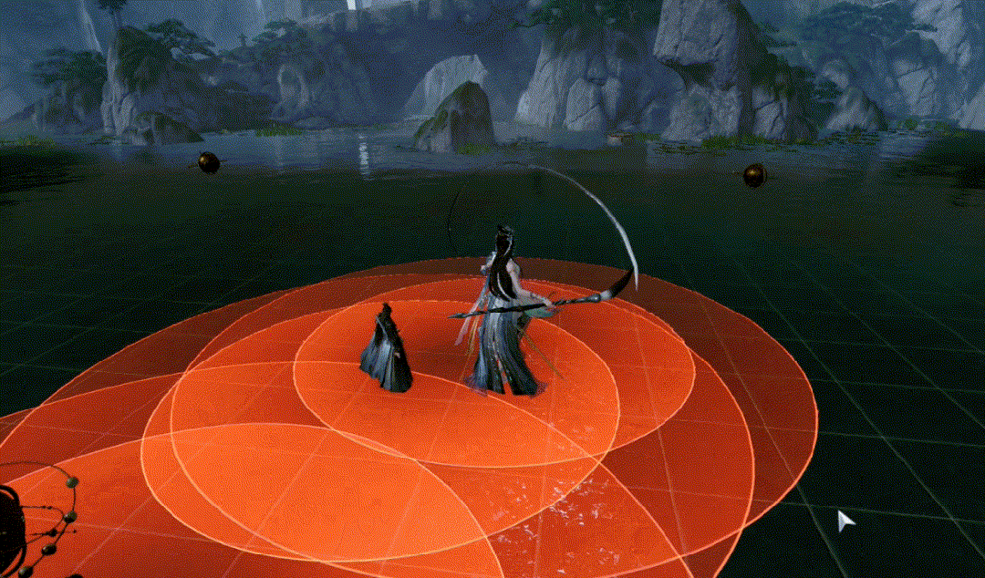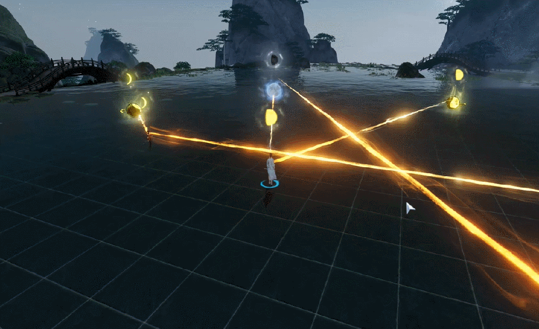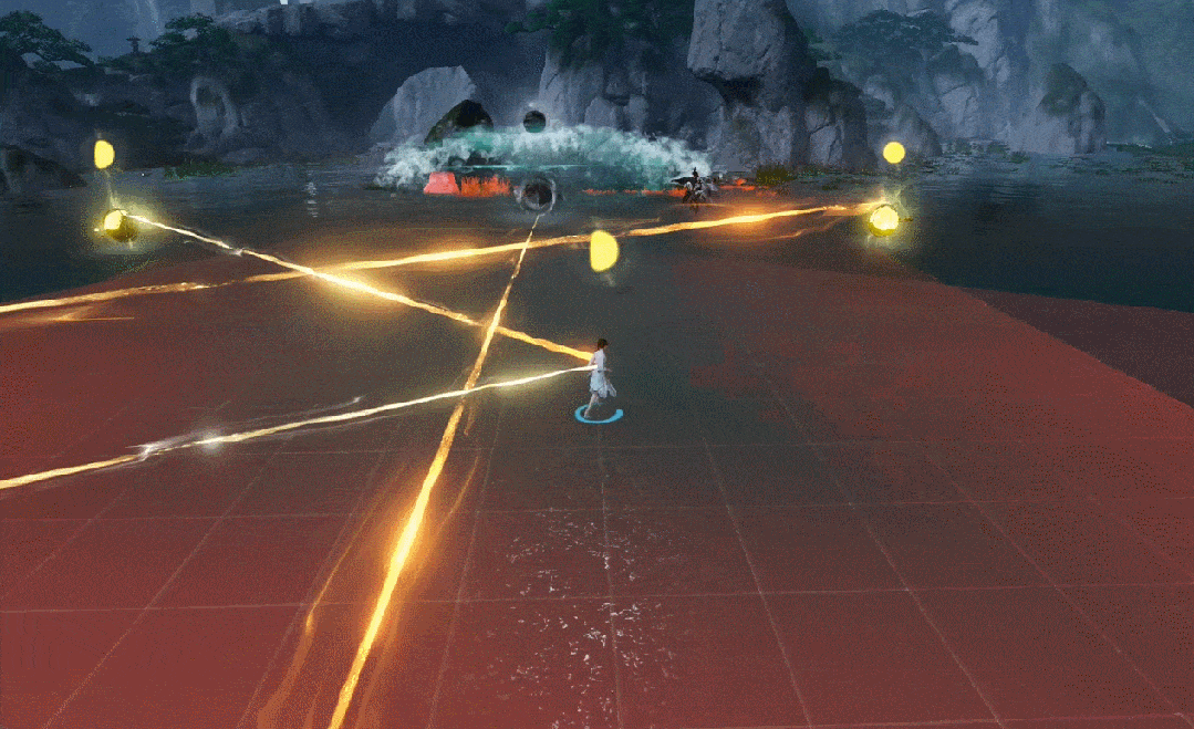 以场地中心为起点逐渐向场地左右两边扩散产生落雷对少侠造成伤害。