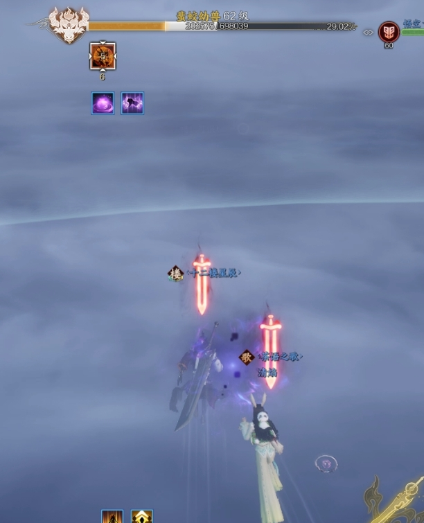 3.第一次转阶段BOSS会变成紫雾躲在场边,场中间会出现左归幻想,需要第一时间找到BOSS,利用左归的技能将BOSS护盾打掉。(注意红色扇形和头上箭头消失直接shift躲开即可)两轮攻击即可打掉护盾。