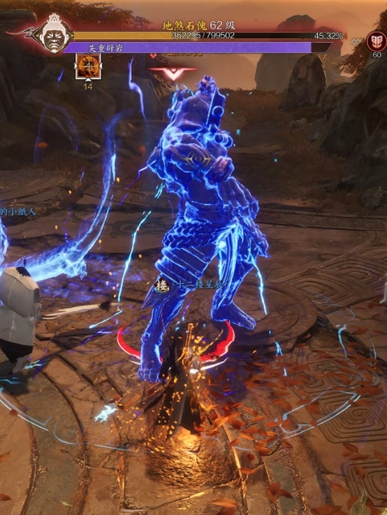 6. BOSS技能怒雷一掷,举起场上石柱砸向一位玩家,躲开即可。需要注意随着场上石柱减少,T要及时将BOSS带到有石柱的地方输出。方便对有躲石柱后面躲避技能。